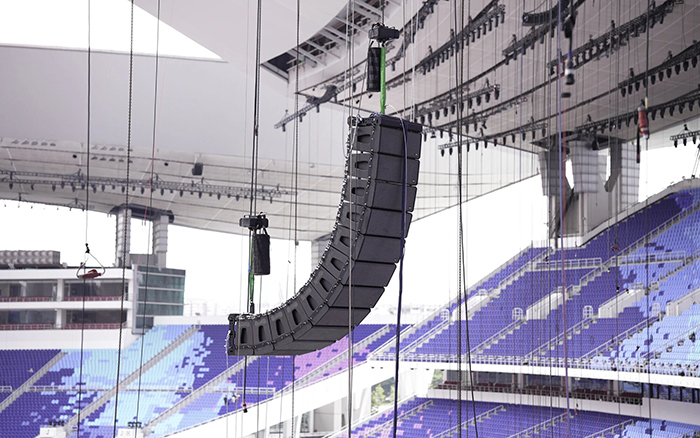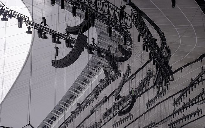 开幕式前夕,突如其来的台风天气为筹备工作带来了巨大挑战。不仅考验着临时搭建的设备可靠性,更对系统的防水、防风、防潮性能提出了极高要求。LAX团队提前部署,针对恶劣天气制定了详尽的应急预案。所有户外部署的线性阵列音箱及功放设备均采用了高防护等级设计,S700MC等高强度特种钢材,为线阵列音响的核心承重与吊挂提供了可靠的刚性保障,确保了设备在风雨中依然坚如磐石。同时,基于氮化镓材料的高效能功放,在保持强劲驱动力的同时,自身发热量更低,运行更稳定,有效避免了因设备过热或潮湿引发的故障风险,保障了系统长时间、不间断稳定运行,用技术定力抵御了自然的考验。